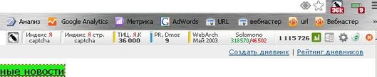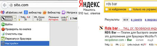 При нажатии на значок RDS bar всплывает окно в котором показывается комплекс сервисов: PR, ТИЦ, индексация, наличие в основных каталогах, беклинки, alexia rank, и др.